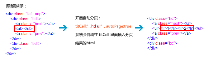 如果开启autoPage:true,此时titCell要指定为分页按钮的父层,因为系统会自动往titCell里面添加分页html!